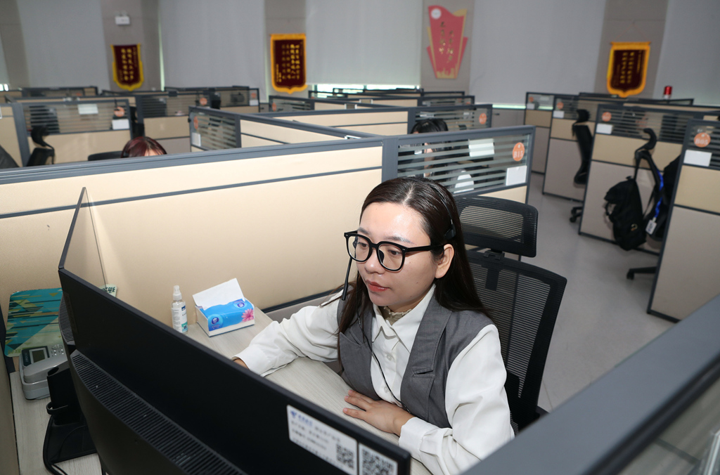 在12345熱線話務大廳里,話務員正全神貫注接聽每一個來電。