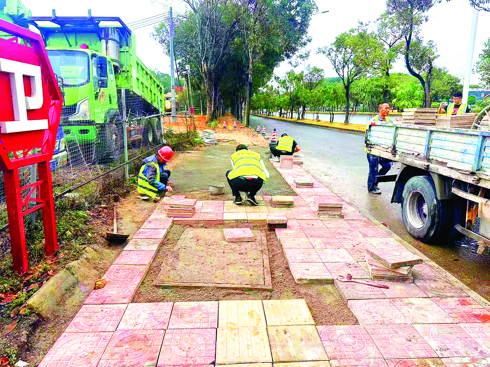 在惠州大道馬安段,多名維修人員正在給破損路面鋪設(shè)新地磚。
