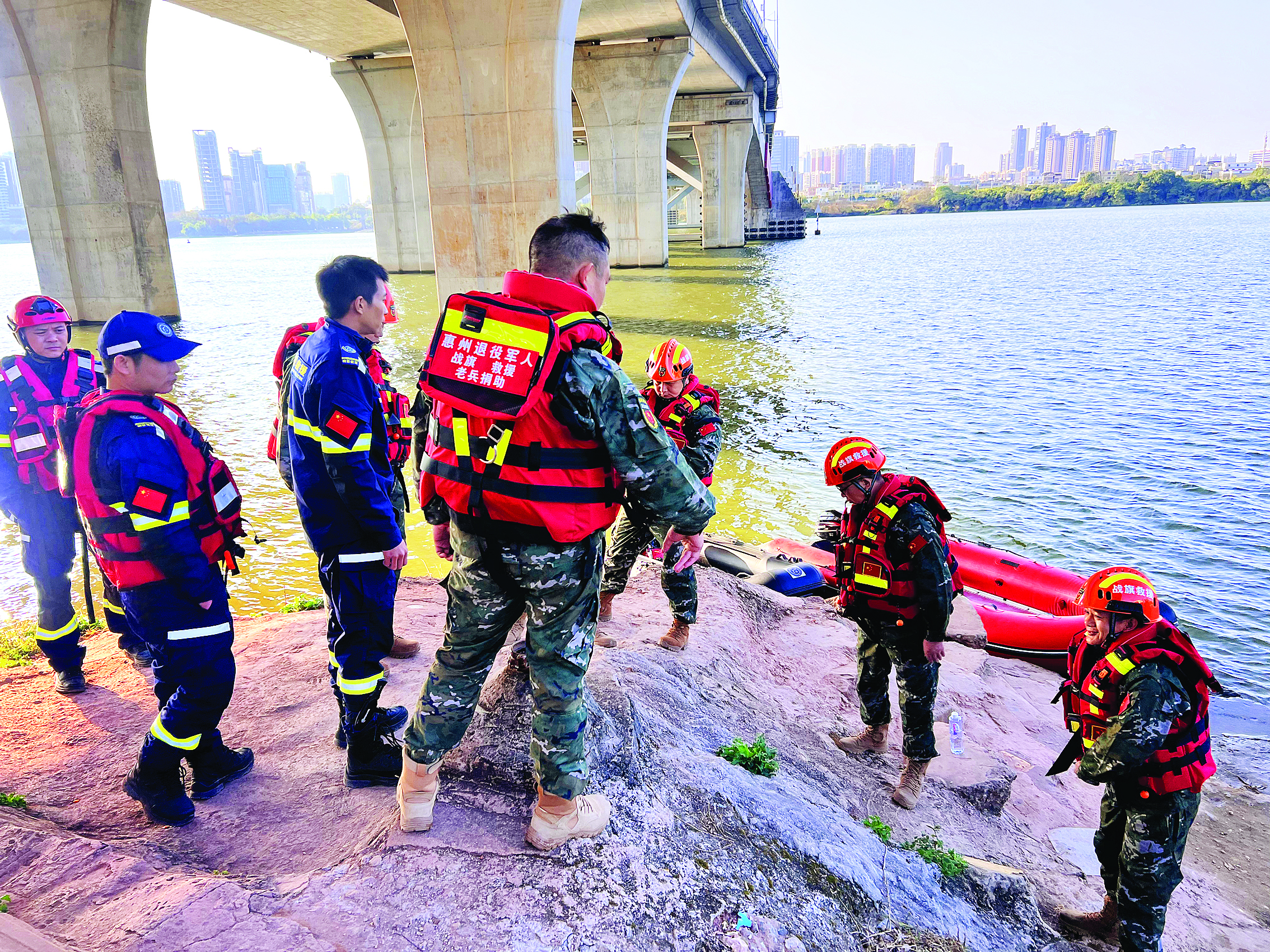 惠州市退役軍人戰(zhàn)旗志愿服務(wù)總隊(duì)?wèi)?yīng)急救援隊(duì)發(fā)動(dòng)戰(zhàn)旗志愿者開展防溺水安全巡江行動(dòng)。 惠州市退役軍人服務(wù)中心供圖