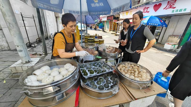 離開南門市場,記者來到橋東市場,穿過一條充滿煙火氣的小巷,和好小吃店的濃郁艾草香便撲面而來。店主江定好正馬不停蹄地趕制艾粄與青團,只見她嫻熟地揉團、制皮、裹餡,指尖翻飛間,一個個圓潤飽滿、翠色欲滴的青團次第成型。