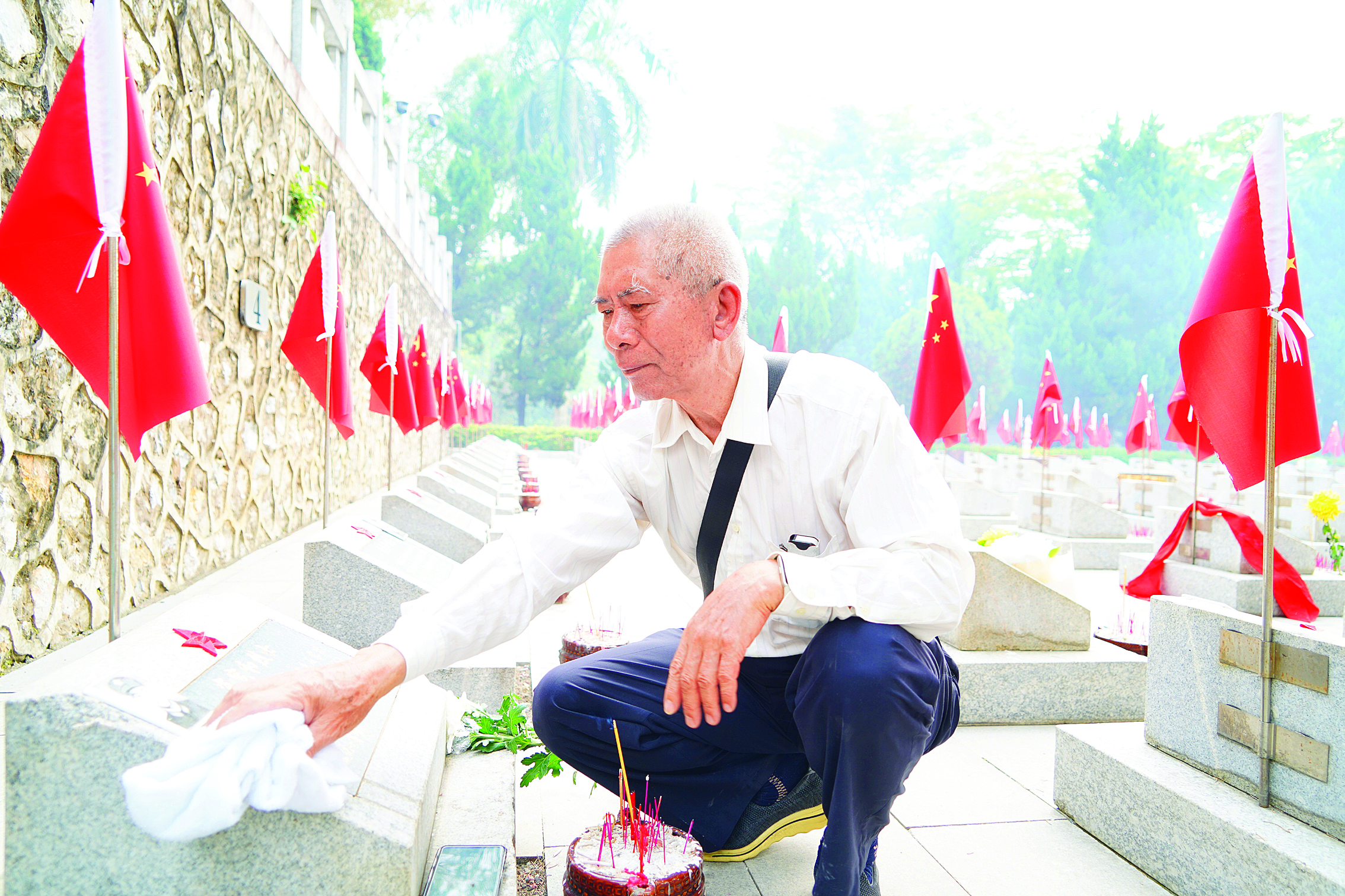 儀式結(jié)束后,代表團成員逐一來到惠州籍烈士墓碑前,俯身擦拭碑上塵土,敬獻潔白鮮花,深情閱讀碑文。“當年,你們從家鄉(xiāng)奔赴南疆邊陲,用青春和熱血捍衛(wèi)了祖國的領(lǐng)土完整。今天,我們代表家鄉(xiāng)父老來看望你們……”在烈士墓碑前,大家都輕聲訴說著思念。烈士親屬撫摸著親人的墓碑,哽咽著講述家鄉(xiāng)多年來翻天覆地的變化。一幕幕深情的場景,跨越時空的對話,讓在場的每一個人都為之動容。