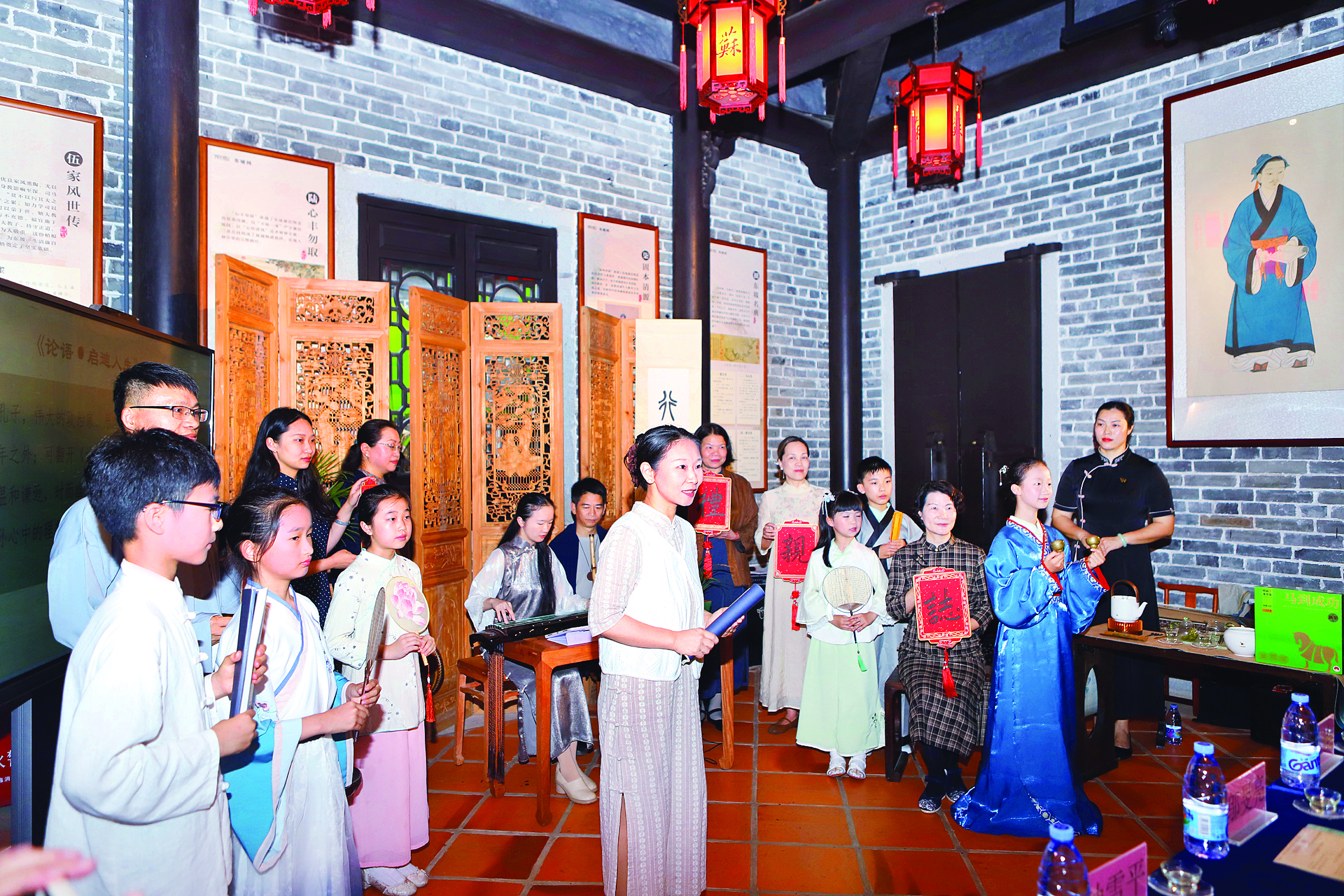 緬懷儀式結(jié)束后,活動(dòng)轉(zhuǎn)入德有鄰堂內(nèi),清雅意境即刻拉滿。古琴獨(dú)奏《憶故人》悠然響起,琴音深沉悠遠(yuǎn)、婉轉(zhuǎn)低回,似在述說對(duì)先賢的追思。緊接著,情景劇展演《論語·啟迪人生》、少兒吟誦《詩經(jīng)·蒹葭》、古琴吟誦《和子由澠池懷舊》、古琴昆唱《臨江仙·九十日春都過了》等13個(gè)特色節(jié)目輪番上演,讓現(xiàn)場(chǎng)觀眾沉浸式感受經(jīng)典魅力。