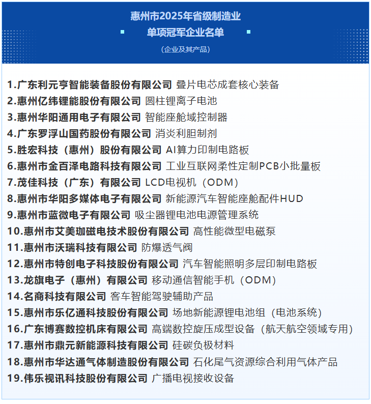 此次新晉的19家省級(jí)制造業(yè)單項(xiàng)冠軍企業(yè),覆蓋智能裝備、新能源電池、汽車(chē)電子、醫(yī)藥健康等多個(gè)惠州優(yōu)勢(shì)產(chǎn)業(yè)鏈。利元亨生產(chǎn)的疊片電芯成套核心裝備、億緯鋰能生產(chǎn)的圓柱鋰離子電池、勝宏科技生產(chǎn)的AI算力印制電路板、華陽(yáng)多媒體生產(chǎn)的新能源汽車(chē)智能座艙配件HUD……這些“惠州造”拳頭產(chǎn)品,在全國(guó)乃至全球市場(chǎng)占據(jù)領(lǐng)先地位,成為惠州產(chǎn)業(yè)向高端化、智能化、綠色化轉(zhuǎn)型的有力見(jiàn)證。