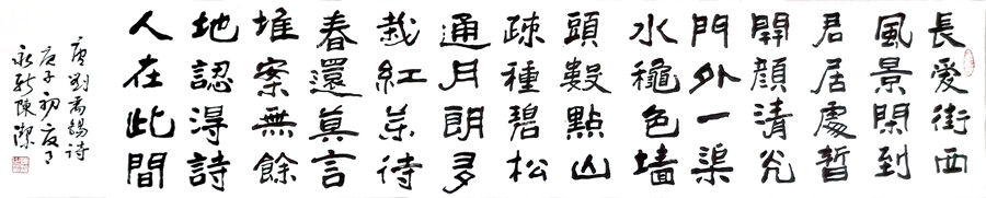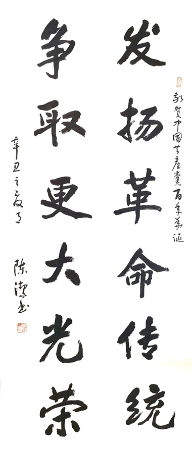 在習(xí)書的過程中,陳潔一直堅(jiān)持向古人學(xué)習(xí),博采眾長。在臨帖時(shí),他會深入了解帖子創(chuàng)作當(dāng)時(shí)的背景、社會環(huán)境以及書法家當(dāng)時(shí)的創(chuàng)作狀態(tài)和人生經(jīng)歷,感受其創(chuàng)作的過程!傲私饬颂颖澈蟮臇|西,才能掌握該帖的文化精髓,對自己的學(xué)習(xí)和創(chuàng)作很有幫助!爆F(xiàn)在,陳潔幾乎每晚都要在工作室練習(xí)書法2個(gè)小時(shí)以上。對他來說,練習(xí)書法既能修身養(yǎng)性,又能豐富自己。陳潔說,退休以后,他會把更多精力花在書法藝術(shù)上,希望到自己六十八九歲時(shí),能通過自己的勤奮努力,在書法理論和實(shí)踐上都上一個(gè)新的臺階。此外,他還將用更多時(shí)間服務(wù)社會,參加文藝下鄉(xiāng)、文藝志愿服務(wù)等,推廣和傳承書法藝術(shù)。