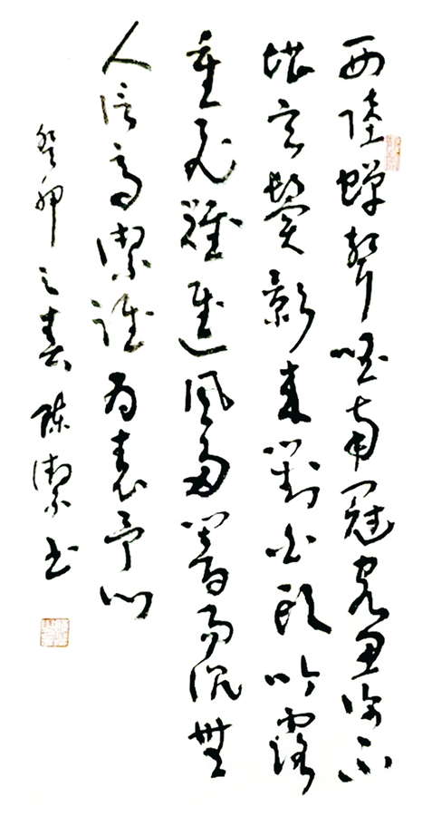 “書法既要有深厚的古文化功底,又要有胸襟、膽略、氣勢與激情,缺一不可,缺少任何一個(gè)都有可能使創(chuàng)作出的作品缺乏氣勢與力度,一幅好的作品更高的要求是把握氣韻,必須一氣呵成!标悵嵏嬖V記者,學(xué)習(xí)書法不能只學(xué)習(xí)書寫的形,更重要的是書法的“神”,得其神韻方為真。