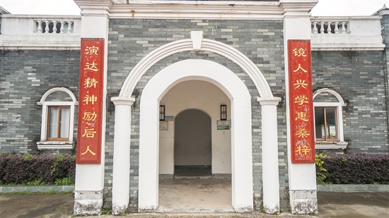 站在教學(xué)樓前,首先看到的是新門樓對聯(lián)“鏡人興學(xué)惠桑梓;演達(dá)精神勵后人”,木刻的對聯(lián)古香古色,細(xì)細(xì)品味,兩代人的精神縈繞其上、延綿不斷,讓人連聲稱贊;抬頭仰望,門樓山墻上鄧鏡人所題的楹聯(lián)“培植資時(shí)雨;英雄起草茅”鑲嵌其間,至今仍熠熠生輝、秉燭大地。拱券門窗、羅馬立柱、中式竹節(jié)欄桿等中西建筑元素相結(jié)合,整座建筑看起來端莊厚重、歷久彌新。