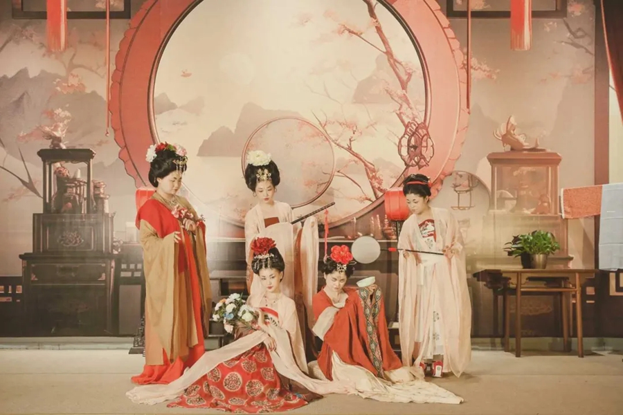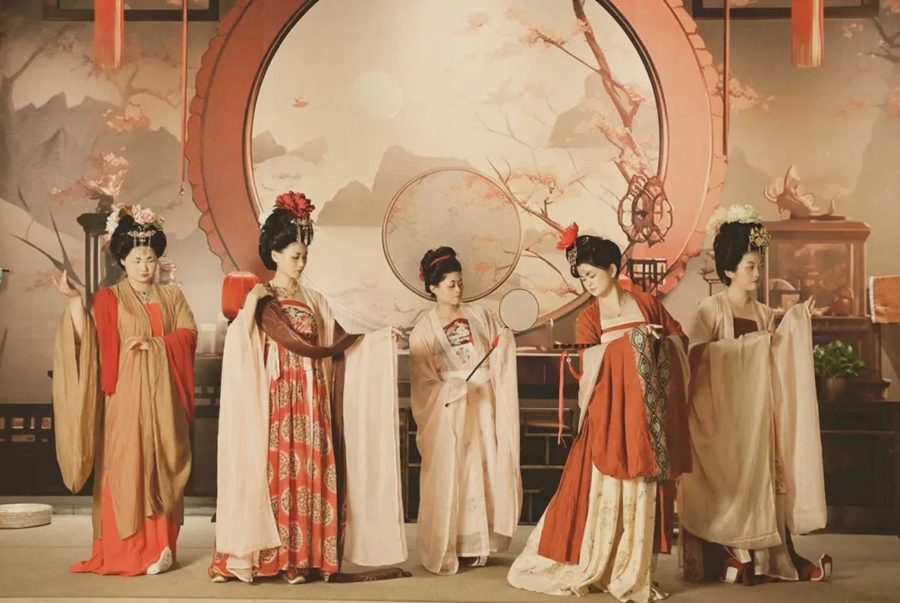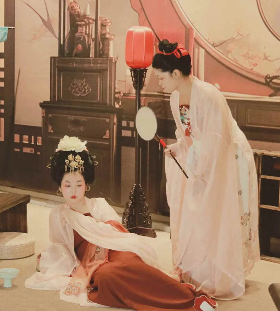 她們妝容精致,眉如遠(yuǎn)山含翠,唇似點(diǎn)朱砂,再現(xiàn)了唐代女性的妝容特點(diǎn);她們舉止優(yōu)雅,步態(tài)輕盈,仿佛從畫中走來,在畫中鏡中如遇畫中人。