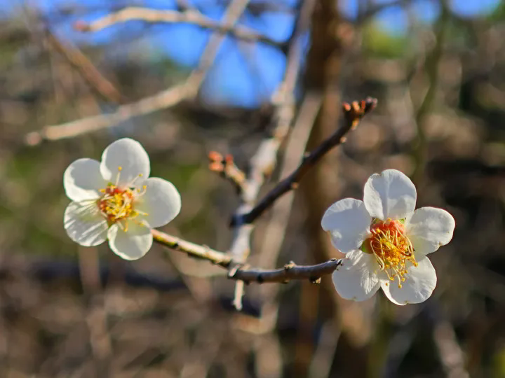 眼下,梅山別夢(mèng)的梅花正三三兩兩地率先盛開,零零星星地點(diǎn)綴于枝頭。在藍(lán)天白云的映襯下,純潔高雅的梅花傲然挺立,為人們帶來生命的力量。