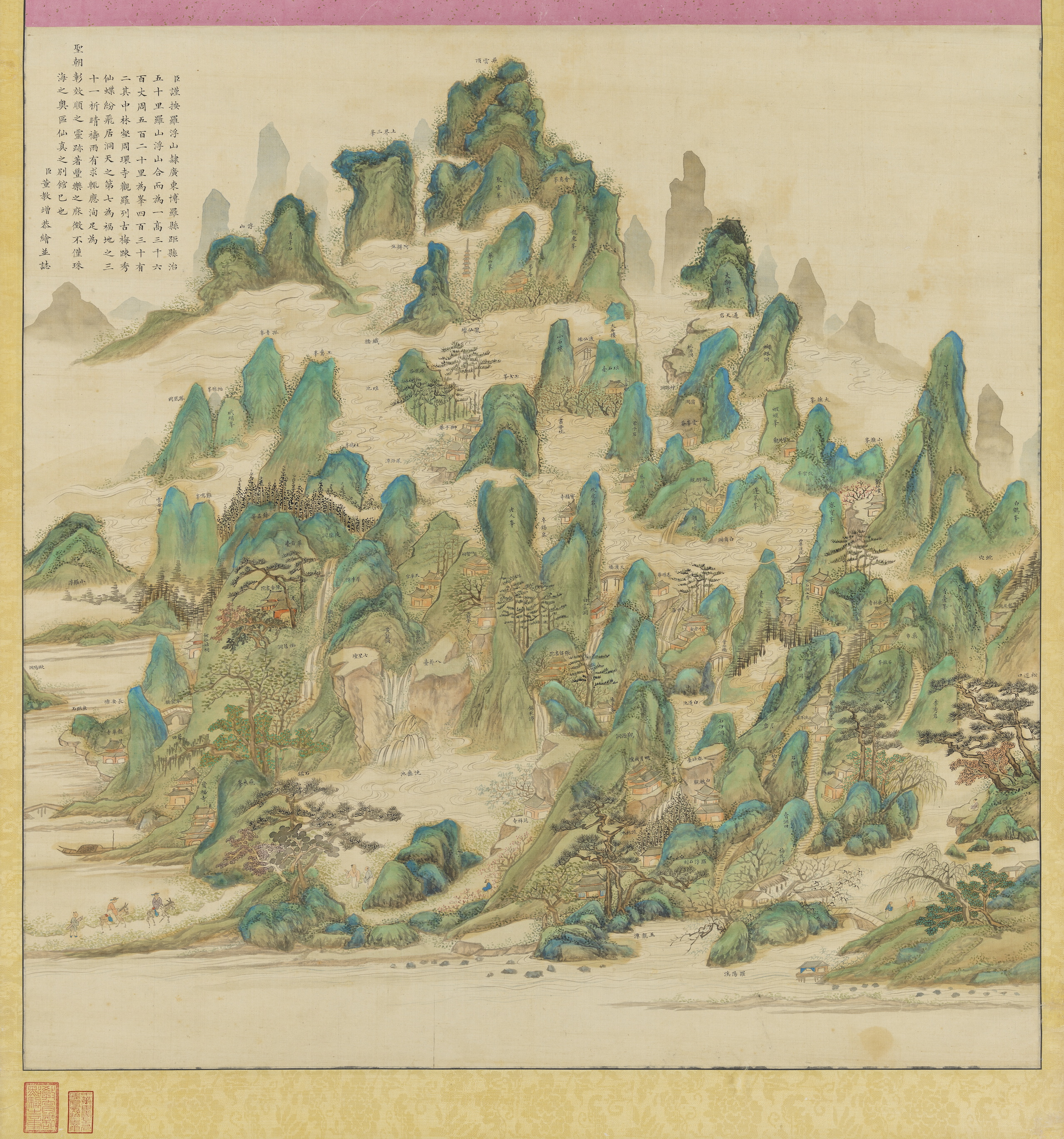 嘉慶二十二年(1817),廣東巡撫董教增離任,進京考績。他擅長繪畫,曾游羅浮山,知道嘉慶帝對羅浮山很向往,特地繪制青綠山水《羅浮山圖》回京復(fù)命。