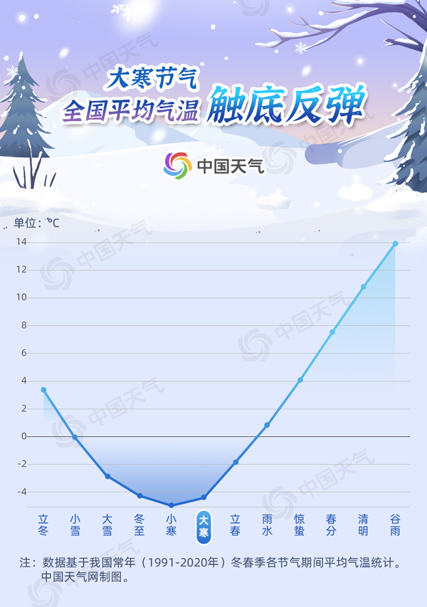 中國天氣網(wǎng)盤點1991年至2020年節(jié)氣大數(shù)據(jù)發(fā)現(xiàn),在小寒期間,全國平均氣溫跌到全年最低,僅有-5.1℃。而到了大寒節(jié)氣,氣溫開啟反彈之旅,比小寒上升0.6℃,達到-4.5℃。從全國平均氣溫而言,我國在小寒節(jié)氣達到最冷,大寒節(jié)氣雖然依舊天寒地凍、萬物蟄藏,但氣溫觸底反彈、生機潛伏,春天的腳步越來越近了。
