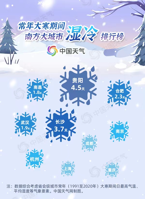 長沙、合肥、武漢、南昌也是大寒期間濕冷的代表城市。冬日里,不到5℃甚至0℃左右的氣溫,伴隨著連日的雨雪,屋里屋外一樣冷,都是這些城市在大寒期間常常遭遇的情景。此外,江南地區(qū)的南京、杭州、上海和西南地區(qū)的成都、重慶也都在濕冷排行榜上有名。