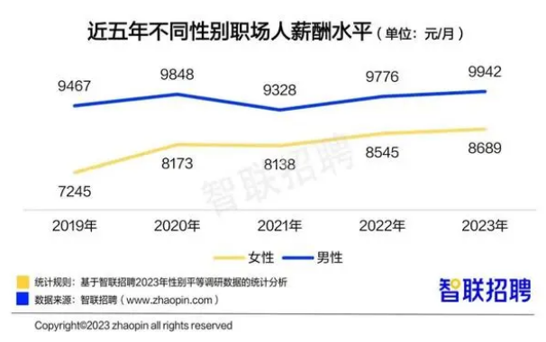 從薪酬來看,2023年,女性的平均薪酬為8689元/月,與男性的9942元/月相差1253元,總體來看,男女薪酬差距呈逐年縮窄趨勢。2019年,女性比男性月薪低23.5%,2023年相差約12%。報告認為,這在一定程度上說明女性的職場價值日益得到更多認可。