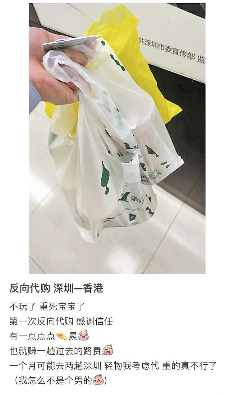 “賺的都是辛苦錢!”雖然從深圳代購產品赴港的市場越來越大,但小莉坦言,像自己這種小成本的美食跨境代購利潤不高,還要花費較多的時間和體力。“從學校出發(fā)回香港要一個小時左右,途中采購需要20分鐘,然后過關坐港鐵到家本來是20分鐘左右,但因為地鐵沿途要下車,在各個送貨地點與客戶接頭,又會耽誤一點時間。”累計下來,小莉做一次“反向代購”需要額外花將近一個小時的時間。