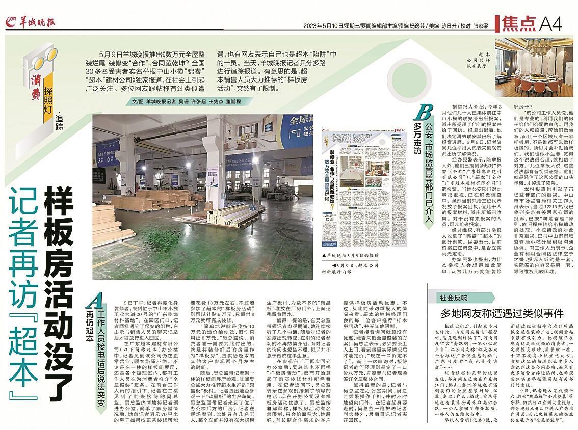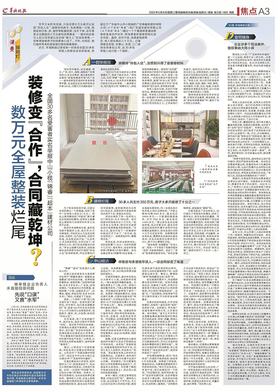 5月9日羊城晚報推出《數(shù)萬元全屋整裝爛尾 裝修變“合作”,合同藏乾坤?全國30多名受害者實名舉報中山小欖“錦睿”“超本”建材公司》獨家報道,并作了追蹤報道。