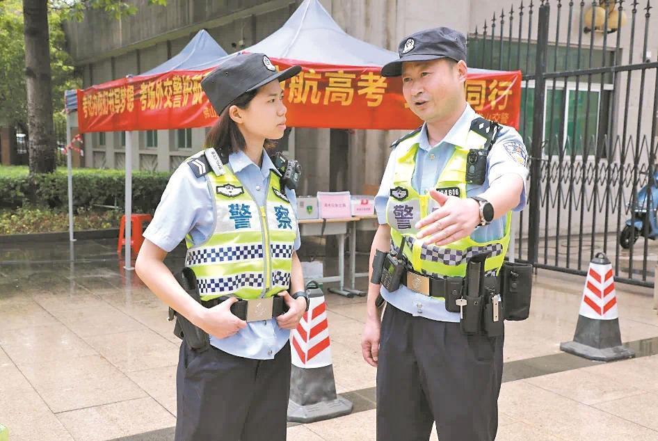 “這些高考應急包要提前擺好”“提前拉好警戒線,錐形筒要擺好,做好人流導控”“要留意陪考家長的狀態(tài),天氣太熱,身體容易出現(xiàn)不適”……校門口,趙方明帶著陳芷嵐跑前跑后,傳授著護考經(jīng)驗,手上的動作也沒停著,從警務便民車上拿來高考應急藥箱、備用包、錐形筒等一一擺好,看到有家長送考生前來,又趕緊迎上去疏導指揮車輛、行人有序通行,提醒家長謹慎小心駕駛,確保場外秩序井然。沒多久,兩人身上的警服就被汗水打濕。