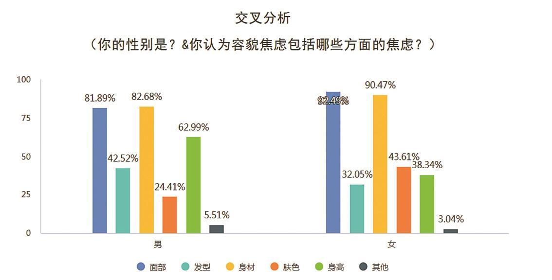 雖然男女對(duì)容貌的關(guān)注重點(diǎn)不同,但大多數(shù)受訪大學(xué)生認(rèn)為面部(90.32%)、身材(88.87%)對(duì)容貌焦慮而言最重要,其次是身高、膚色、發(fā)型。男生女生對(duì)容貌的關(guān)注重點(diǎn)不同,男生的關(guān)注更傾向于身材(82.68%),而女生更在意面部(92.49%)。