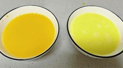 記者實(shí)測(cè)對(duì)比,左邊為濃縮雞蛋液,兌水后呈橙色;右邊為兩枚雞蛋,攪拌并兌水后呈黃色,顏色相差較大。