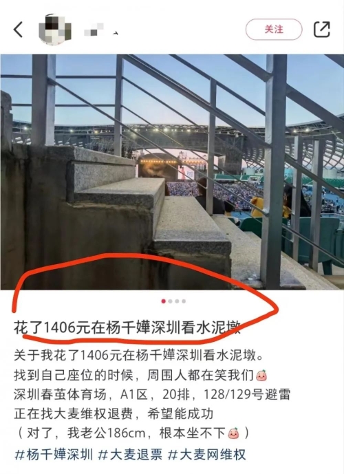 近日,有歌迷在某社交平臺吐槽,自己在楊千嬅演唱會深圳站買到“水泥墩位”:座位正前方就是水泥臺階,視線被遮擋了大半。