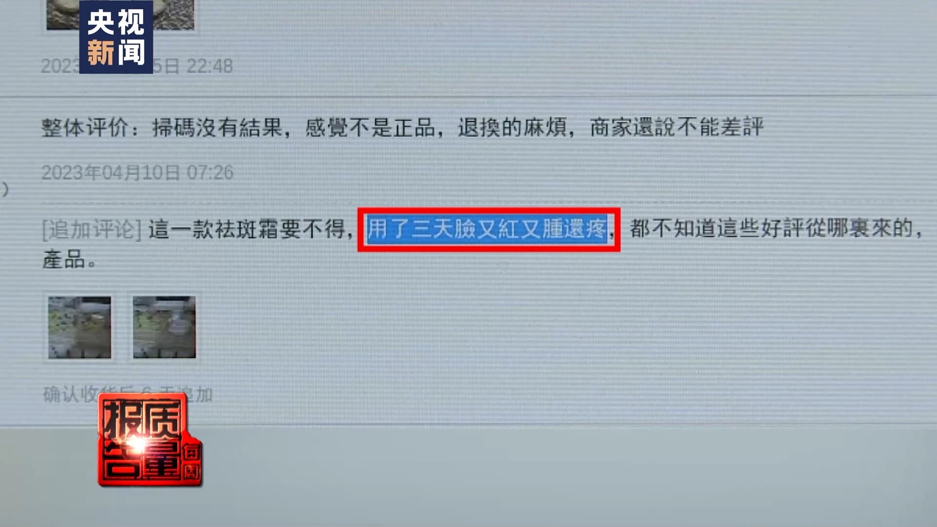 江蘇省消費(fèi)者權(quán)益保護(hù)委員會(huì)監(jiān)督部主任 趙鑫:美白祛斑類的產(chǎn)品作為護(hù)膚品,它是不應(yīng)該有醫(yī)療相關(guān)的風(fēng)險(xiǎn),正常使用的情況下也不應(yīng)該對(duì)皮膚造成損傷。所以如果消費(fèi)者反饋說(shuō)使用以后存在著一些紅腫、脫皮、疼痛等反應(yīng),那商家或者是客服回復(fù)是正常反應(yīng),或者說(shuō)沒(méi)有反應(yīng)就祛不了斑,那其實(shí)是不科學(xué)的。