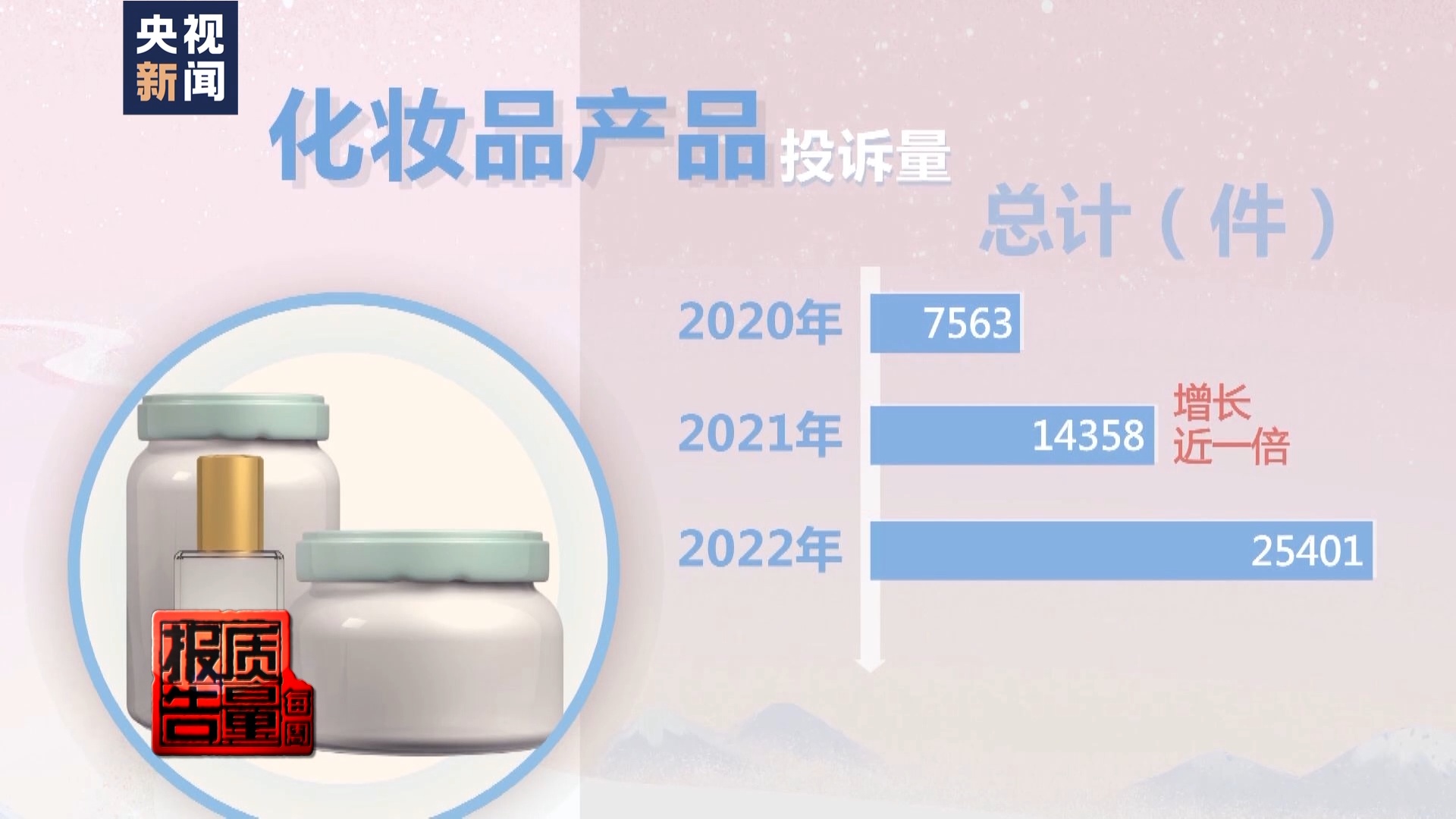 中國(guó)消費(fèi)者協(xié)會(huì)提供給記者的數(shù)據(jù)顯示,2020年至2022年有關(guān)化妝品產(chǎn)品投訴量呈明顯上升趨勢(shì)。2020年有關(guān)化妝品產(chǎn)品投訴總計(jì)7563件,2021年有關(guān)化妝品產(chǎn)品投訴總計(jì)14358件,增長(zhǎng)了近一倍,到了2022年,投訴量就增長(zhǎng)到了25400多件(25401件)。