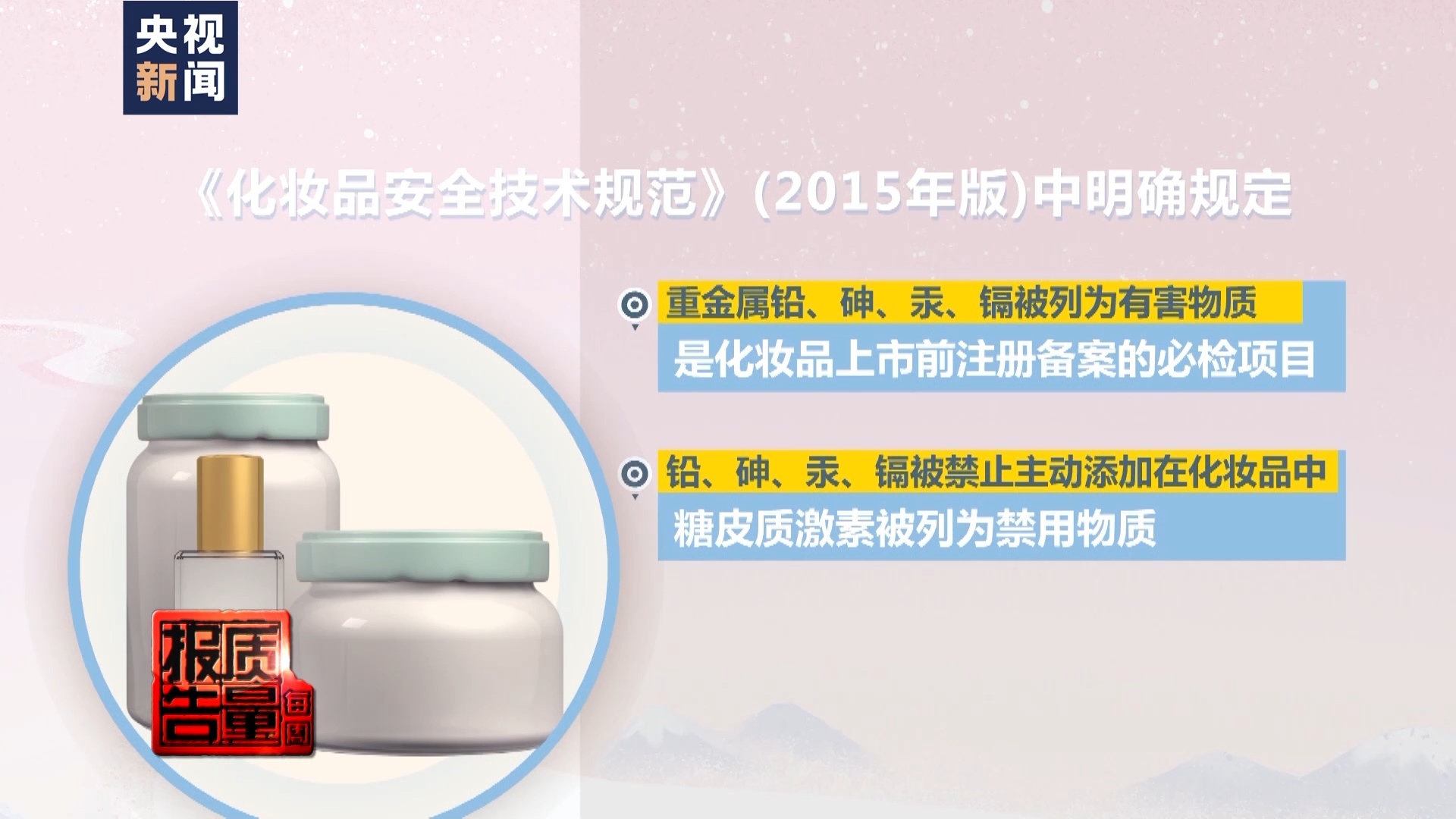 檢測(cè)專家向記者介紹,《化妝品安全技術(shù)規(guī)范》(2015年版)中明確規(guī)定,重金屬鉛、砷、汞、鎘被列為有害物質(zhì),是化妝品上市前注冊(cè)備案的必檢項(xiàng)目。鉛、砷、汞、鎘被禁止主動(dòng)添加在化妝品中,糖皮質(zhì)激素被列為禁用物質(zhì)。