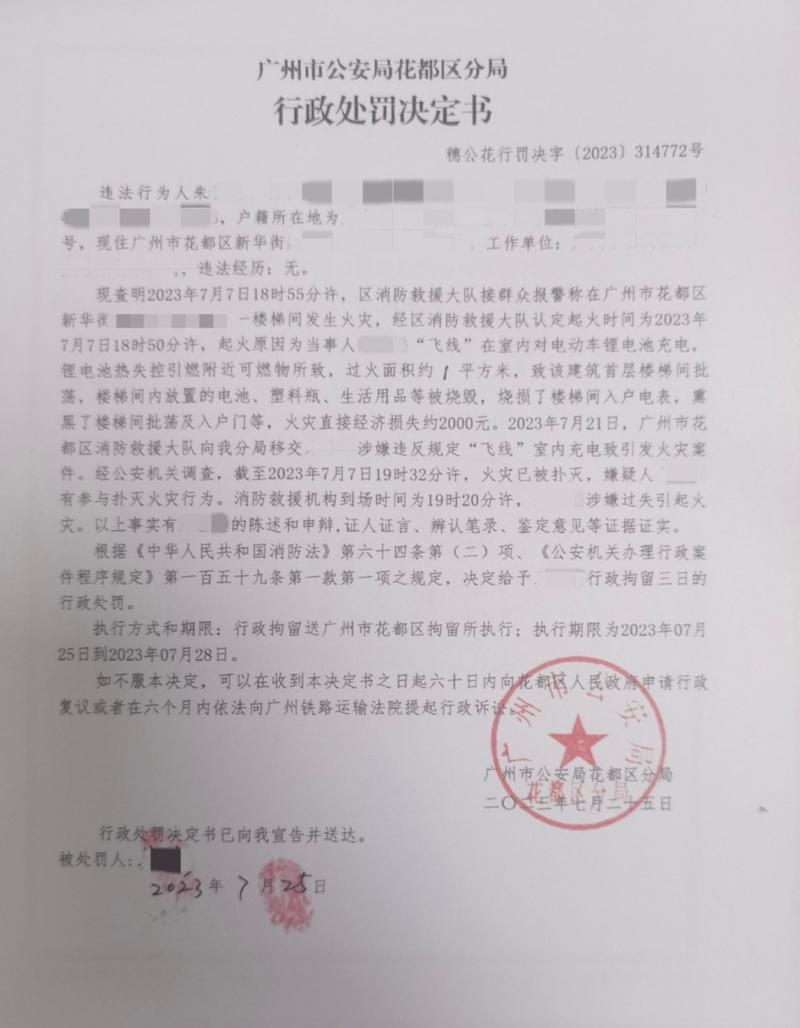 電動自行車雖然便利,但私拉“飛線”充電、整夜充電、違規(guī)在安全通道停放電動自行車等危險行為極易引發(fā)火災(zāi)。記者8月1日從廣州市消防救援支隊獲悉,近日,花都區(qū)一名男子因電動自行車違規(guī)充電引發(fā)火災(zāi)被行政拘留。