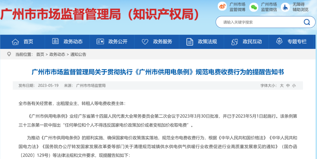 廣州市市場監(jiān)督管理局還專門發(fā)布了關(guān)于貫徹執(zhí)行《廣州市供用電條例》規(guī)范電費(fèi)收費(fèi)行為的提醒告知書,要求各電費(fèi)收費(fèi)主體(包括但不限于村社集體物業(yè)經(jīng)營管理方、出租屋主、二房東,下同)按價格主管部門公布的目錄銷售電價收取電費(fèi),不得擅自提高價格標(biāo)準(zhǔn),并提醒各電費(fèi)收費(fèi)主體立即開展自查自糾。