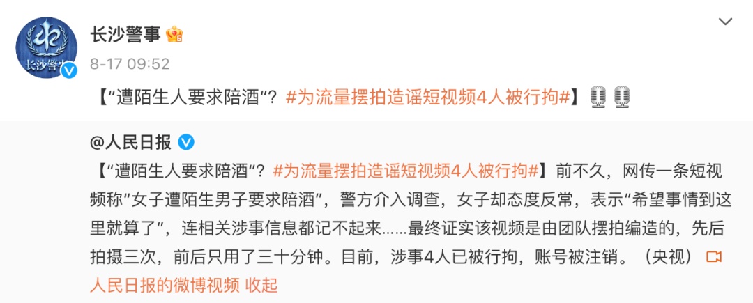 警方介入調(diào)查,最終證實(shí)該視頻是由團(tuán)隊(duì)擺拍編造的,先后拍攝三次,前后只用了三十分鐘。目前,涉事4人已被行拘,賬號(hào)被注銷。