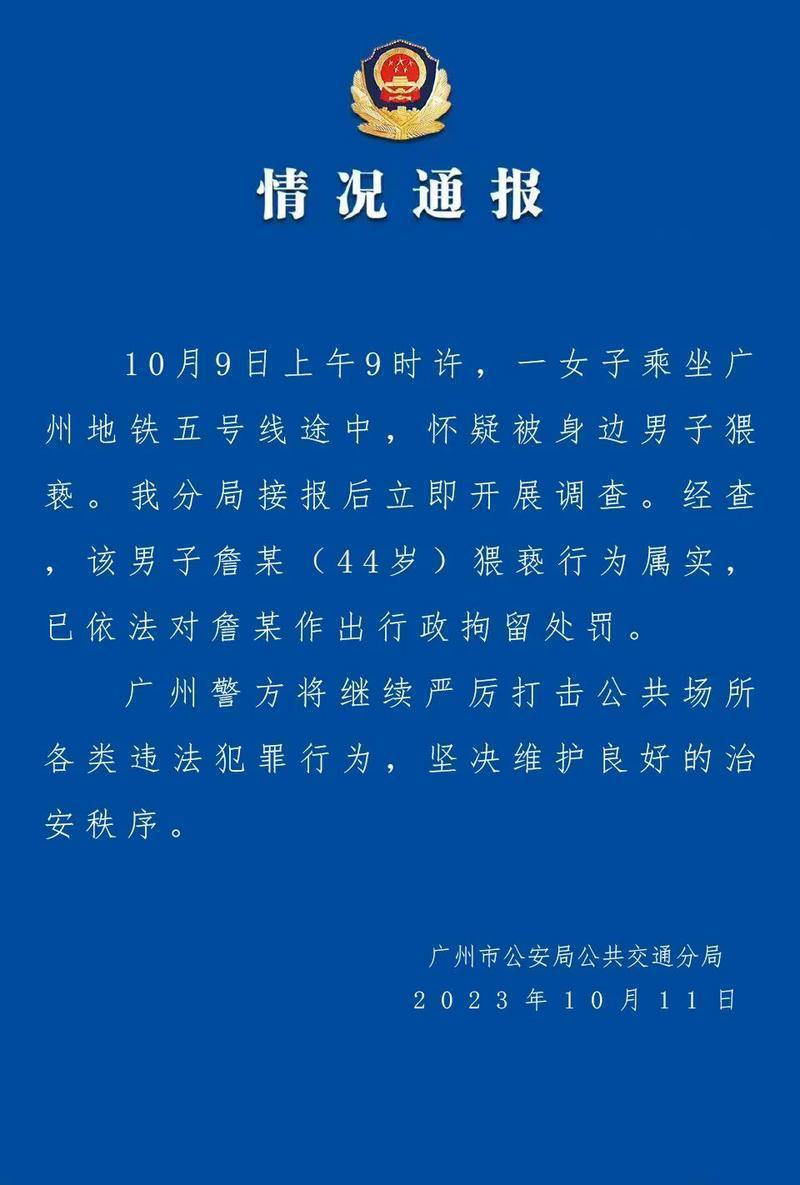 廣州公交警方10月11日下午通報,10月9日上午9時許,一女子乘坐廣州地鐵五號線途中,懷疑被身邊男子猥褻。我分局接報后立即開展調(diào)查。經(jīng)查,該男子詹某(44歲)猥褻行為屬實,已依法對詹某作出行政拘留處罰。廣州警方將繼續(xù)嚴厲打擊公共場所各類違法犯罪行為,堅決維護良好的治安秩序。