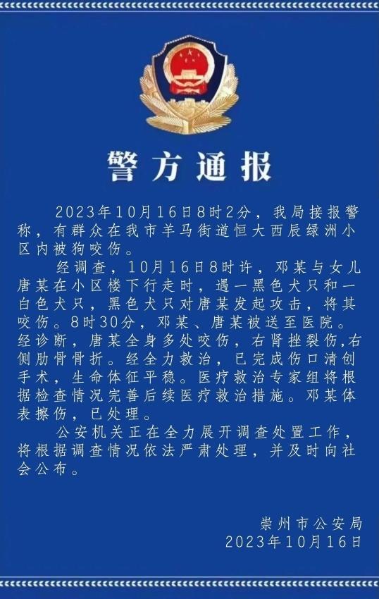 經(jīng)調(diào)查,10月16日8時許,鄧某與女兒唐某在小區(qū)樓下行走時,遇一黑色犬只和一白色犬只,黑色犬只對唐某發(fā)起攻擊,將其咬傷。8時30分,鄧某、唐某被送至醫(yī)院。經(jīng)診斷,唐某全身多處咬傷,右腎挫裂傷,右側(cè)肋骨骨折。經(jīng)全力救治,已完成傷口清創(chuàng)手術(shù),生命體征平穩(wěn)。醫(yī)療救治專家組將根據(jù)檢查情況完善后續(xù)醫(yī)療救治措施。鄧某體表擦傷,已處理。