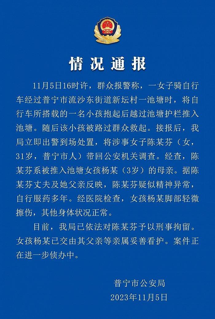 央視網(wǎng)消息:據(jù)“普寧警訊”公眾號(hào)通報(bào),11月5日16時(shí)許,群眾報(bào)警稱(chēng),一女子騎自行車(chē)經(jīng)過(guò)普寧市流沙東街道新壇村一池塘?xí)r,將自行車(chē)所搭載的一名小孩抱起后越過(guò)池塘護(hù)欄推入池塘。隨后該小孩被路過(guò)群眾救起。接報(bào)后,警方立即出警到場(chǎng)處置,將涉事女子陳某芬(女,31歲,普寧市人)帶回公安機(jī)關(guān)調(diào)查。經(jīng)查,陳某芬系被推入池塘女孩楊某(3歲)的母親。據(jù)陳某芬丈夫及她父親反映,陳某芬疑似精神異常,自行服藥多年。經(jīng)醫(yī)院檢查,女孩楊某腳部輕微擦傷,其他身體狀況正常。