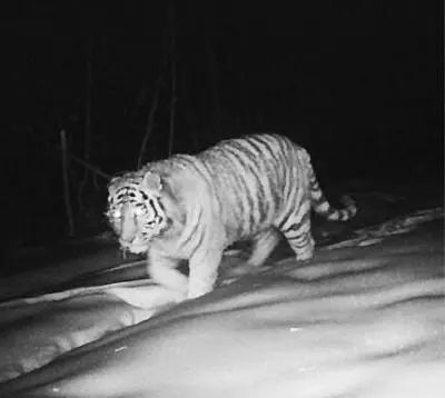 2023年4月13日凌晨,吉林延邊邊境管理支隊敬信邊境檢查站值班民警在視頻巡查時發(fā)現(xiàn),1只野生東北虎在琿春市解放軍營區(qū)附近覓食。