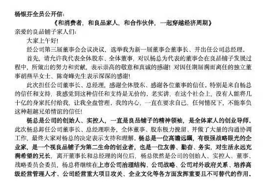 在公開(kāi)信中,楊銀芬稱:“一系列變革的背后,核心目的只有一個(gè):回歸良品鋪?zhàn)余徏倚蜗,走向品質(zhì)好、價(jià)格親民的路線。不變,我們真的有可能失去在牌桌上的資格!