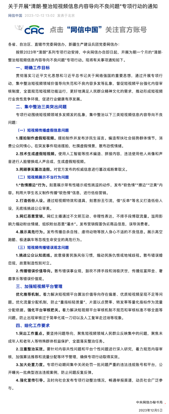12月12日,據(jù)“網(wǎng)信中國(guó)”微信公眾號(hào)消息,中央網(wǎng)信辦自即日起,開(kāi)展為期一個(gè)月的“清朗·整治短視頻信息內(nèi)容導(dǎo)向不良問(wèn)題”專(zhuān)項(xiàng)行動(dòng),其中,短視頻傳播虛假信息的問(wèn)題被列為本次行動(dòng)重點(diǎn)整治對(duì)象。網(wǎng)信辦還表示,將集中打擊杜撰虛假情景、散布恐慌情緒、傳播消極厭世價(jià)值觀的視頻亂象。