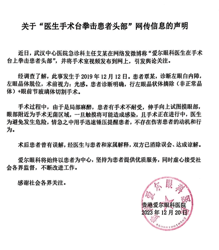 對此,貴港愛爾眼科21日凌晨在微信公眾號發(fā)聲明回應稱:經調查了解,此事發(fā)生于2019年12月12日;颊唏,診斷左眼白內障,左眼晶體脫位,在行左眼晶狀體摘除(非正常晶體)+眼前節(jié)玻璃體切割手術過程中,由于是局部麻醉,患者有手術不耐受,伸手向上試圖摸眼部,眼部附近為手術無菌區(qū)域,一旦觸摸將可能造成感染,且手術正在進行中,醫(yī)生為避免發(fā)生危險,情急之中用手迅速錘壓提醒患者,不存在傷害患者的動機和行為。