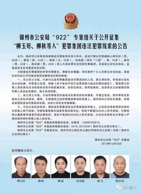 婁河舉報(bào)的柳秋犯罪集團(tuán)人員到案,警方懸賞征集該團(tuán)伙違法犯罪線索。圖源:錦州警方公眾號(hào)