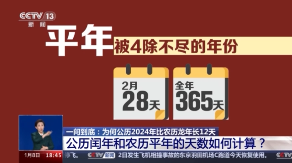 中國(guó)科學(xué)院紫金山天文臺(tái)發(fā)布的日歷資料顯示,公歷2024年為閏年,2月有29天,全年共有366天,而即將到來(lái)的農(nóng)歷甲辰年(龍年)則是平年,全年共有354天。為什么公歷2024年比農(nóng)歷龍年多出了12天?