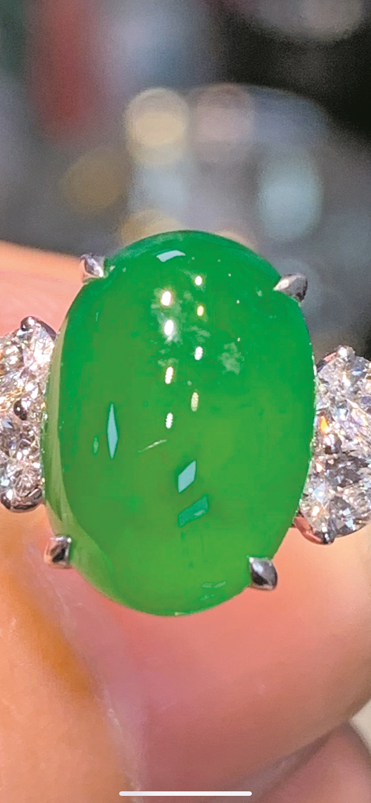 一段視頻記錄了翡翠戒指的掉落過程。視頻顯示,掉落的翡翠呈橢圓形,純綠無雜質(zhì)。翡翠被鑲嵌在一枚銀色戒指上。視頻中,一男子正拿著戒指觀摩,并不時(shí)與玻璃臺(tái)上其他戒指進(jìn)行比較。過程中,男子說道:“我就說嘛,那顆(指玻璃臺(tái)上戒指的翡翠)沒這顆(指手中戒指上的翡翠)大。”隨后,男子拿著戒指走到窗邊,觀摩一下后,又打了一個(gè)嗝,右手大拇指一滑,手中的戒指忽然掉落,隨后在視頻中消失了。