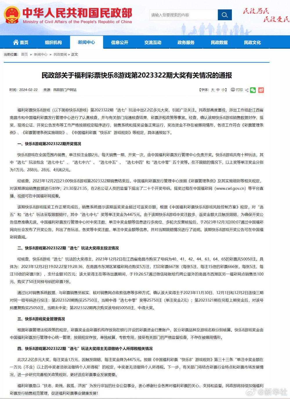 福利彩票快樂8游戲(以下簡稱快樂8游戲)第2023322期“選七”玩法中出2.2億多元大獎,引起廣泛關(guān)注。民政部高度重視,派出工作組赴江西省南昌市和中國福利彩票發(fā)行管理中心進行了認真核查,并與有關(guān)部門溝通核查結(jié)果、彩票涉稅政策等事宜。經(jīng)查,確認該期快樂8游戲銷售數(shù)據(jù)封存、搖獎、現(xiàn)場公證、開獎公告發(fā)布等工作嚴格按照規(guī)定程序進行,銷售系統(tǒng)和搖獎設備正常運行,獎池資金不存在被挪用情形,各項工作符合《彩票管理條例》、《彩票管理條例實施細則》、《中國福利彩票“快樂8”游戲規(guī)則》等規(guī)定,具體通報如下。