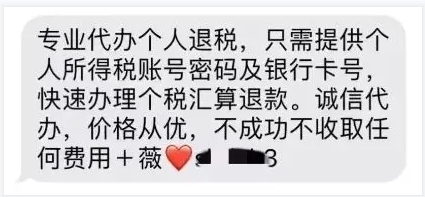 騙子會(huì)通過(guò)電話(huà)或者短信:“只要提供個(gè)稅APP賬號(hào)密碼和銀行卡號(hào),我們就可以幫忙操作辦理個(gè)稅匯算退稅,按退稅到賬金額比例支付服務(wù)費(fèi),若沒(méi)有成功不收取費(fèi)用!”