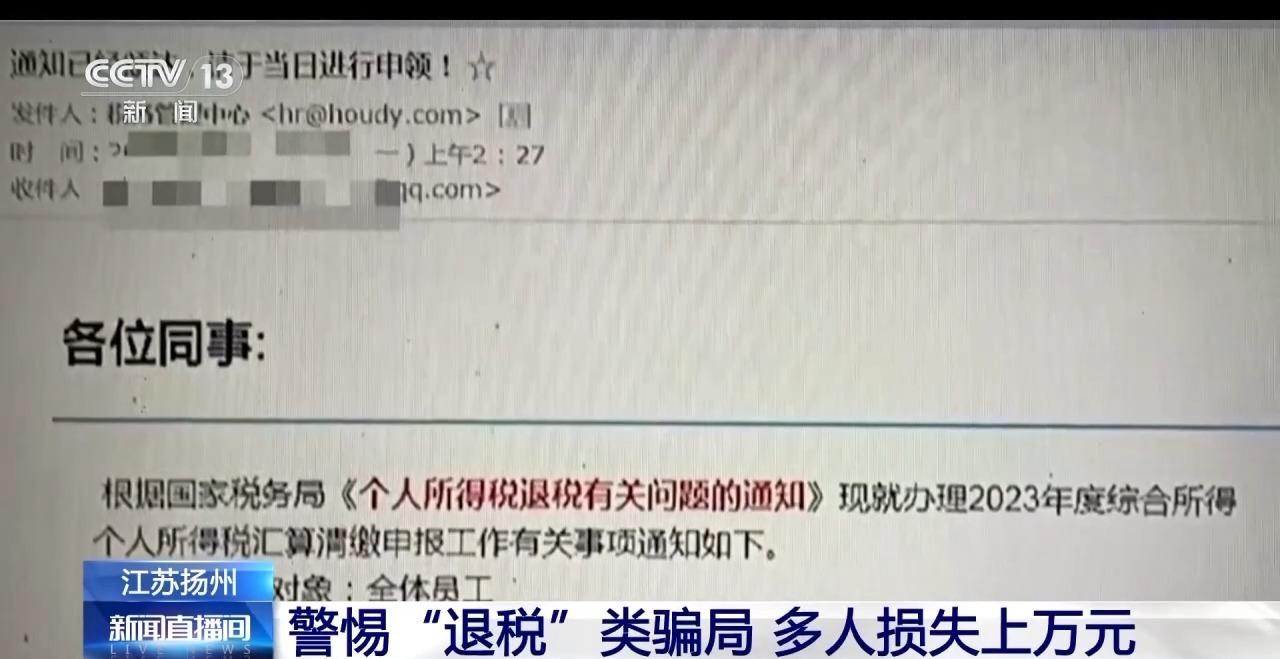警方介紹,近期該類型案件在揚(yáng)州多發(fā),提醒大家在辦理個(gè)稅退款時(shí)要走正規(guī)流程,如果遇到所謂“人工退稅”的郵件和電話,務(wù)必保持警惕。