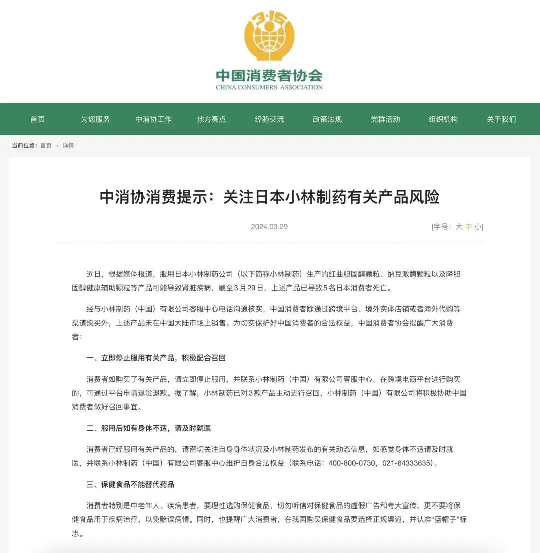 近日,根據(jù)媒體報(bào)道,服用日本小林制藥公司(以下簡稱小林制藥)生產(chǎn)的紅曲膽固醇顆粒、納豆激酶顆粒以及降膽固醇健康輔助顆粒等產(chǎn)品可能導(dǎo)致腎臟疾病,截至3月29日,上述產(chǎn)品已導(dǎo)致5名日本消費(fèi)者死亡。