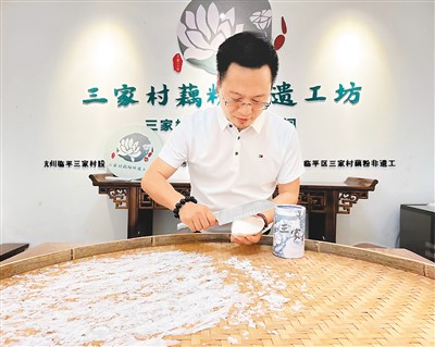 吳景順在三家村藕粉非遺工坊體驗手削藕粉傳統技藝。