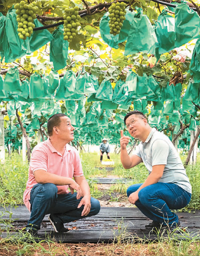 陳李波(右)在崇賢村葡萄種植園與農戶一起察看葡萄長勢。