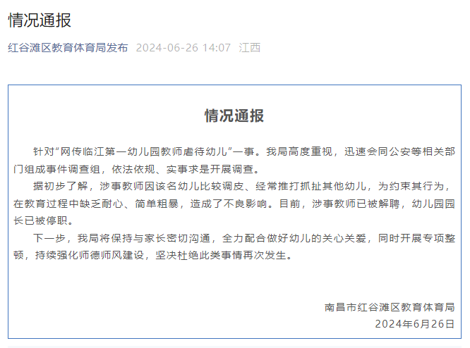 6月26日,針對“網(wǎng)傳臨江第一幼兒園教師虐待幼兒”一事,南昌市紅谷灘區(qū)教育體育局發(fā)布情況通報稱,事發(fā)后紅谷灘區(qū)教育體育局高度重視,迅速會同公安等相關(guān)部門組成事件調(diào)查組,依法依規(guī)、實(shí)事求是開展調(diào)查。