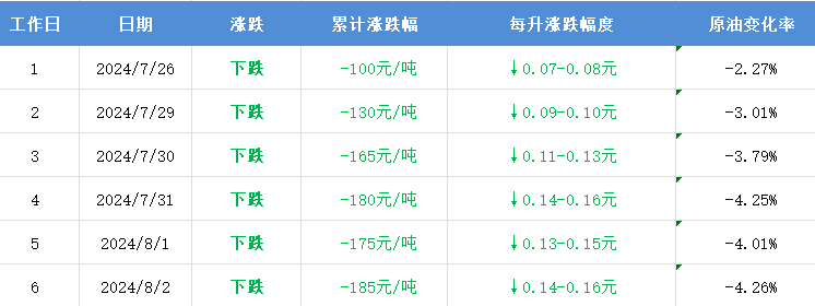 國內(nèi)油價將在8月8日24時(本周四晚12點)進行下半年第3次調(diào)整。本輪國內(nèi)油價計價統(tǒng)計周期第6個工作日,參考原油變化率-4.26%,預計汽柴油下調(diào)185元/噸,折算為每升油價下跌0.14-0.16元。