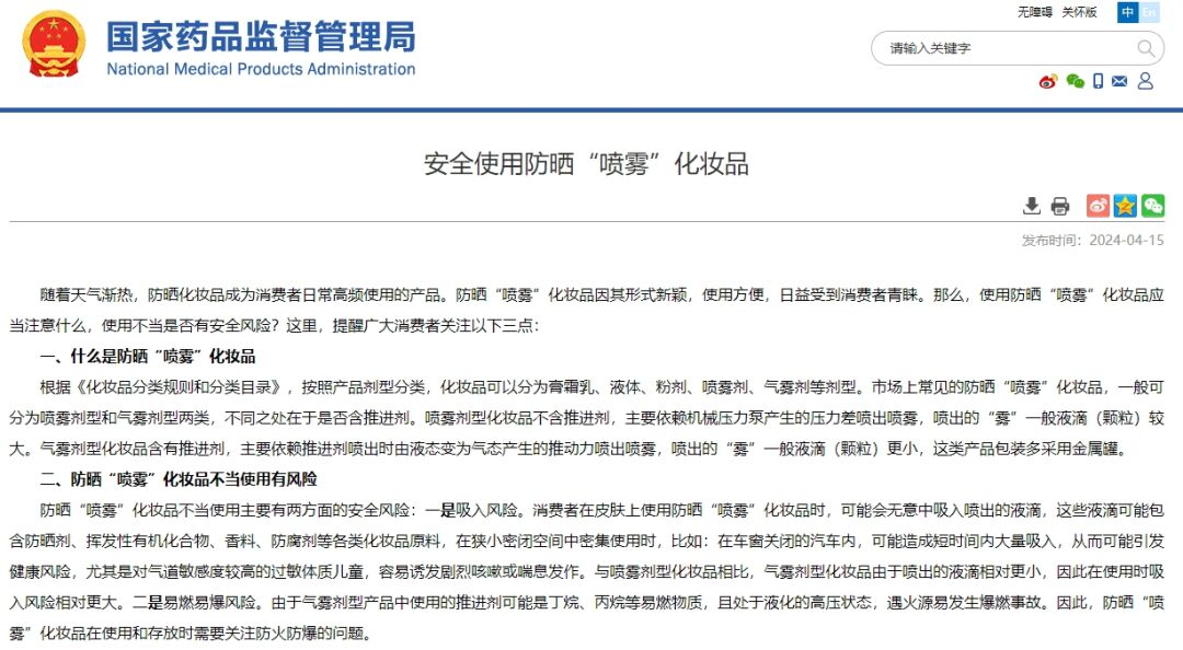 眼下正值酷暑,各種防曬用品熱銷,其中防曬噴霧因便捷易用備受青睞。注意!國家藥監(jiān)局發(fā)布提醒:不建議兒童使用防曬“噴霧”化妝品,尤其是小年齡兒童和過敏體質(zhì)兒童。