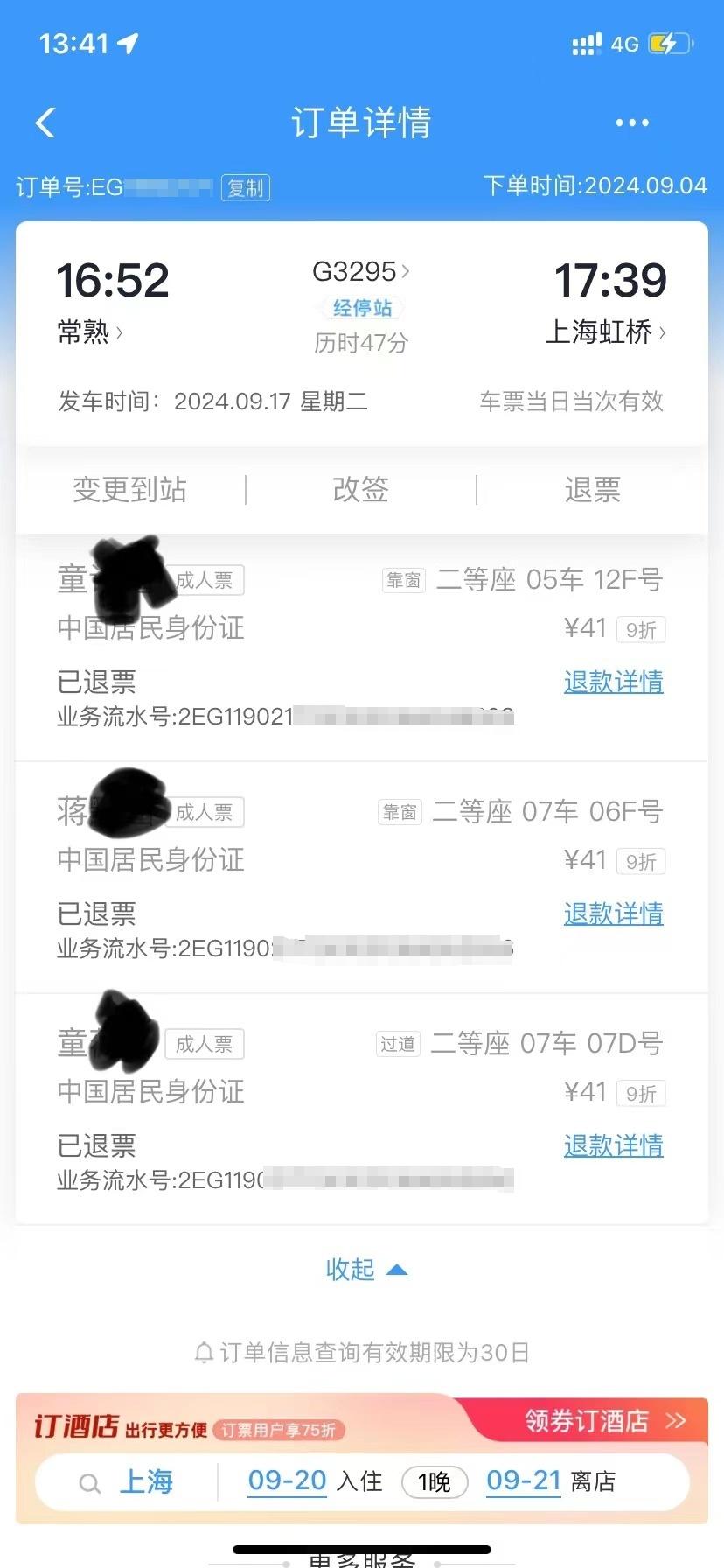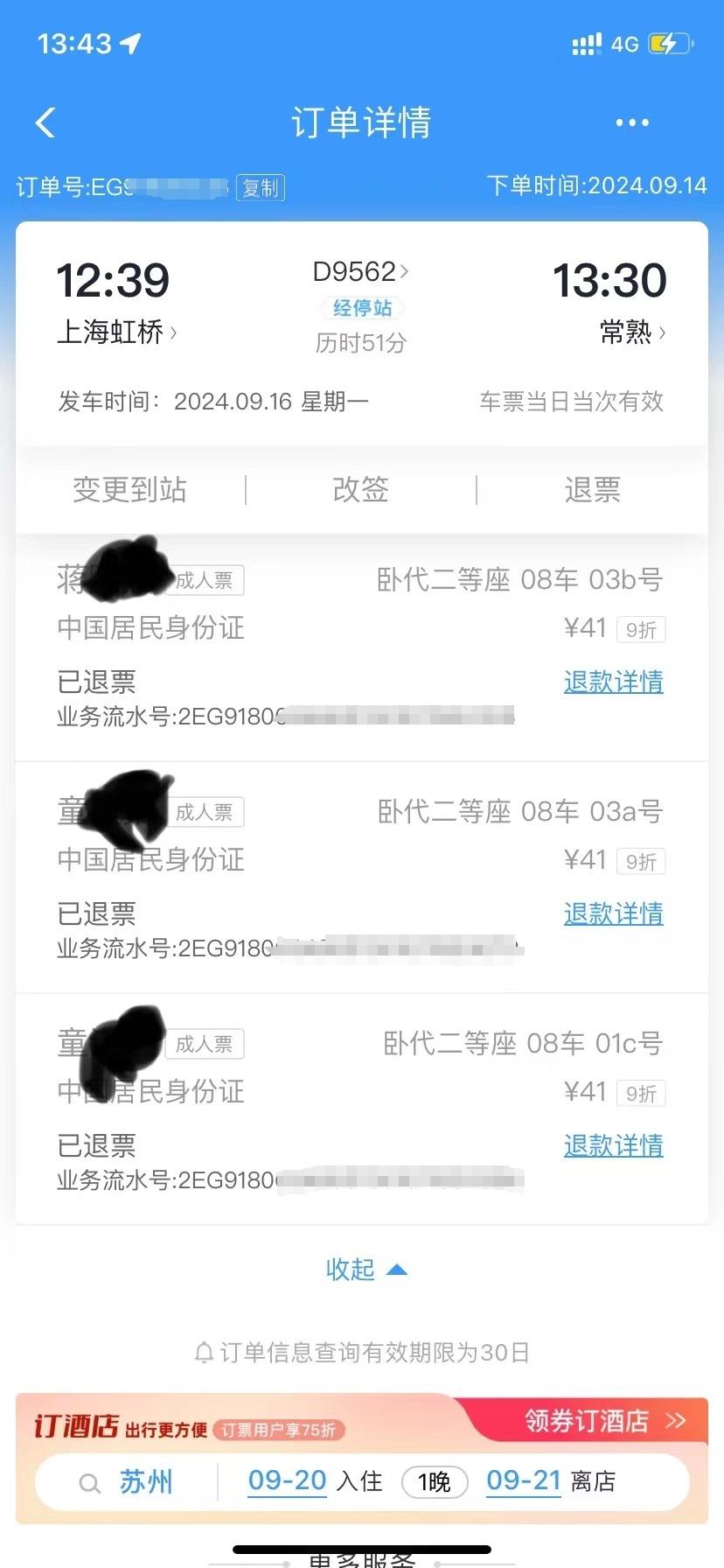 于是在9月14日當晚,童先生又購買了三張9月16日D9562次上海至常熟的動車票。但臺風“貝碧嘉”仍然導致該車次臨時停運。