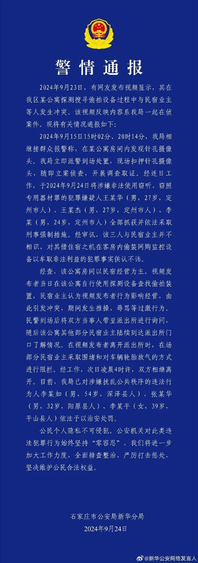 9月24日,石家莊市公安局新華分局發(fā)布警情通報(bào),于2024年9月24日將涉嫌非法使用竊聽、竊照專用器材罪的犯罪嫌疑人王某華(男,27歲,定州市人)、王某杰(男,27歲,定州市人)、李某(男,24歲,定州市人)全部抓獲并依法采取刑事強(qiáng)制措施。