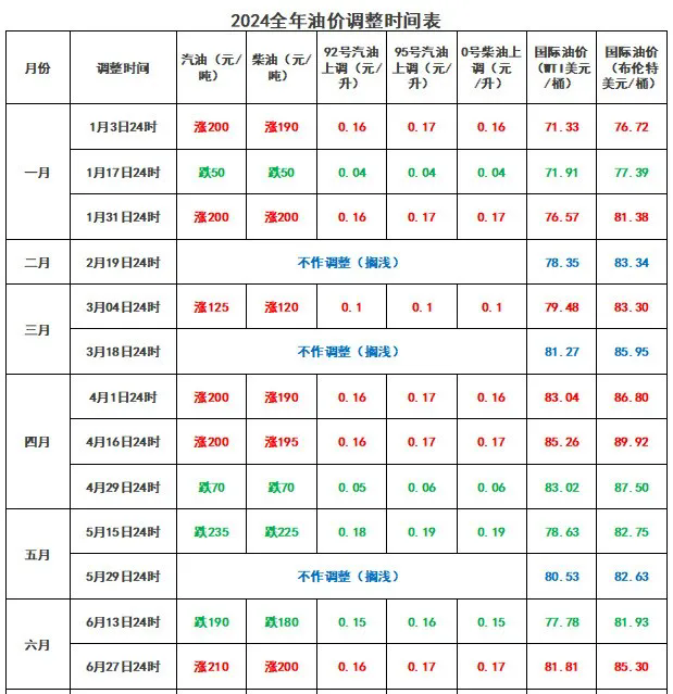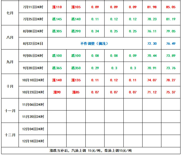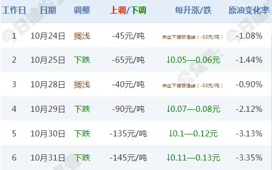 油價(jià)最新調(diào)整消息:本輪油價(jià)調(diào)整時(shí)間為2024年11月06日24時(shí)。截至10月31日,第6個(gè)工作日,汽、柴油價(jià)格下跌145元/噸,折合中石油、中石化、殼牌加油站汽油、柴油價(jià)格下跌0.11—0.13元/升。